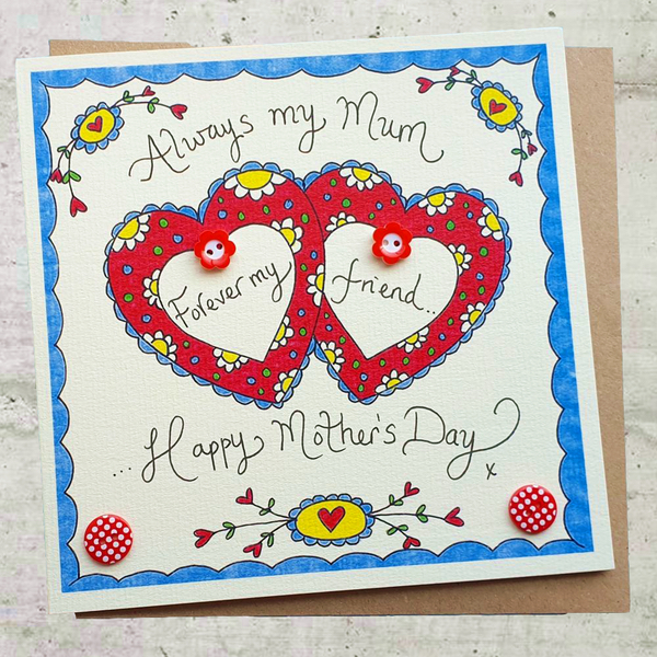 Hand-embellished card designed and created in Yorkshire. A bright and cheerful card to give to Mum this Mother’s Day, made up of a two heart design but with added floral illustration. The card measures 14cm x 14cm and is finished off with red flower and red polka dot buttons.