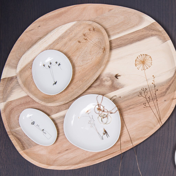 Such a popular product. This set of three glazed porcelain trinket dishes are perfect for using as dishes for jewellery by your bedside, for your keys or purely for decoration. Each has a different image on in gold, featuring flowers or birds. Packaged in a gift box.