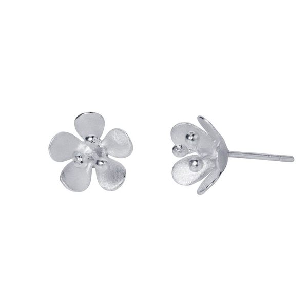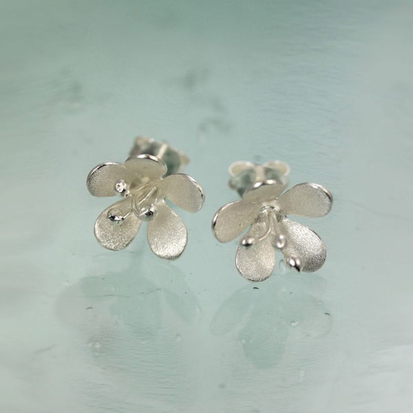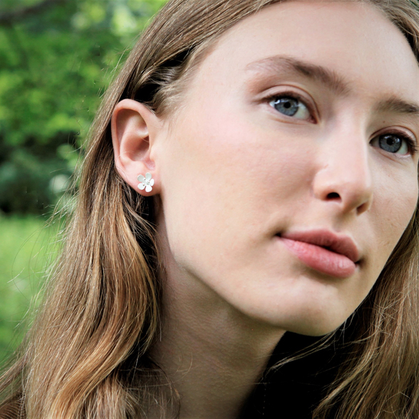 A lovely pair of satin daisy silver stud earrings with silver details. Simple but so pretty!
