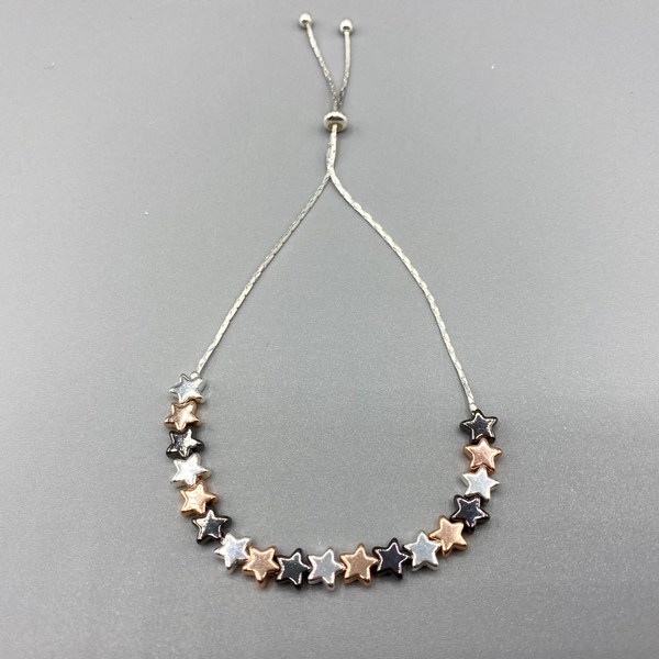 An pretty silver, rose gold and grey stars bracelet, fully adjustable to fit a wide variety of wrist sizes.